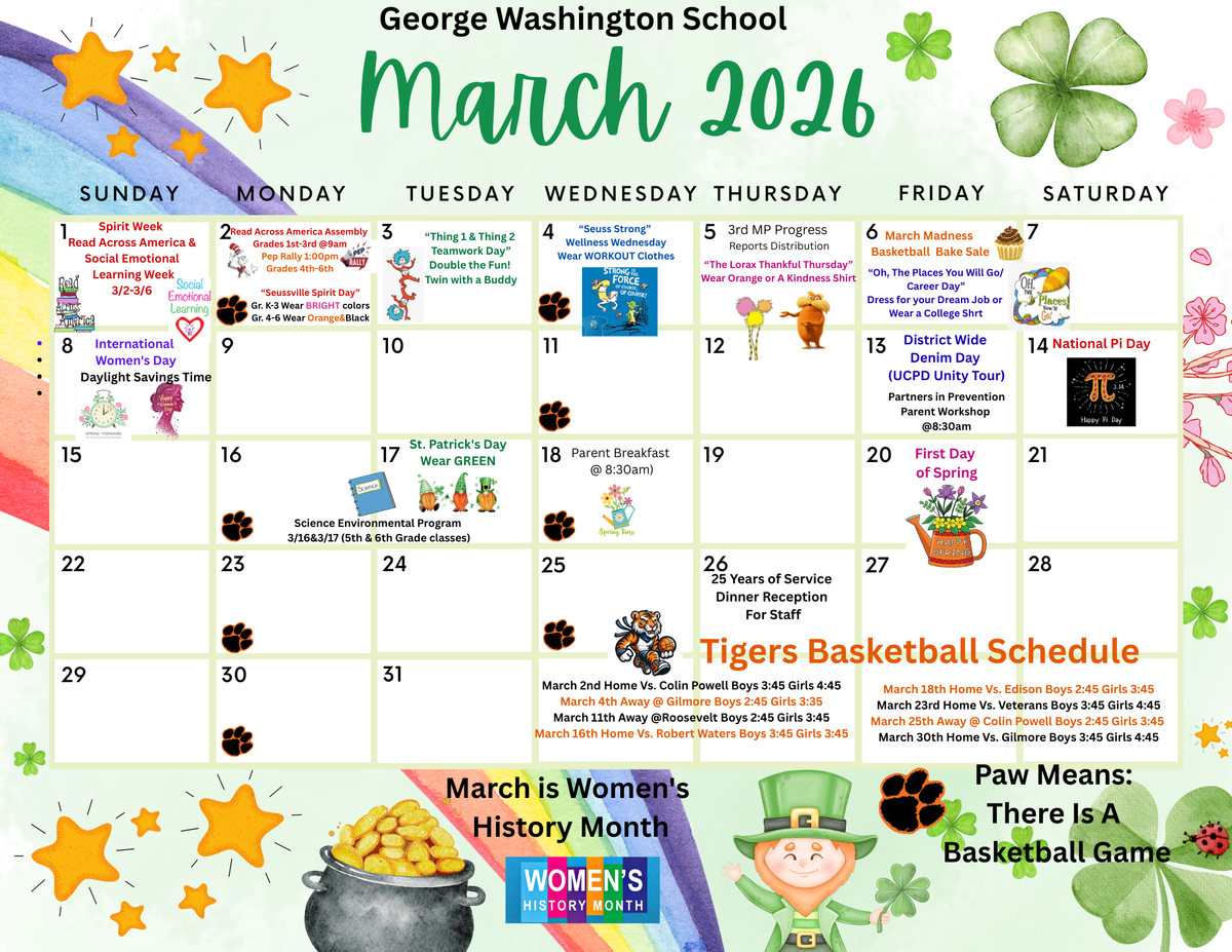 ¡Feliz mes de marzo! Aquí están las últimas noticias e información sobre los próximos eventos relacionados con la escuela Washington. Por favor, dedique un momento a revisar nuestro calendario de marzo de 2026, además de nuestras actividades de Read Across America.
